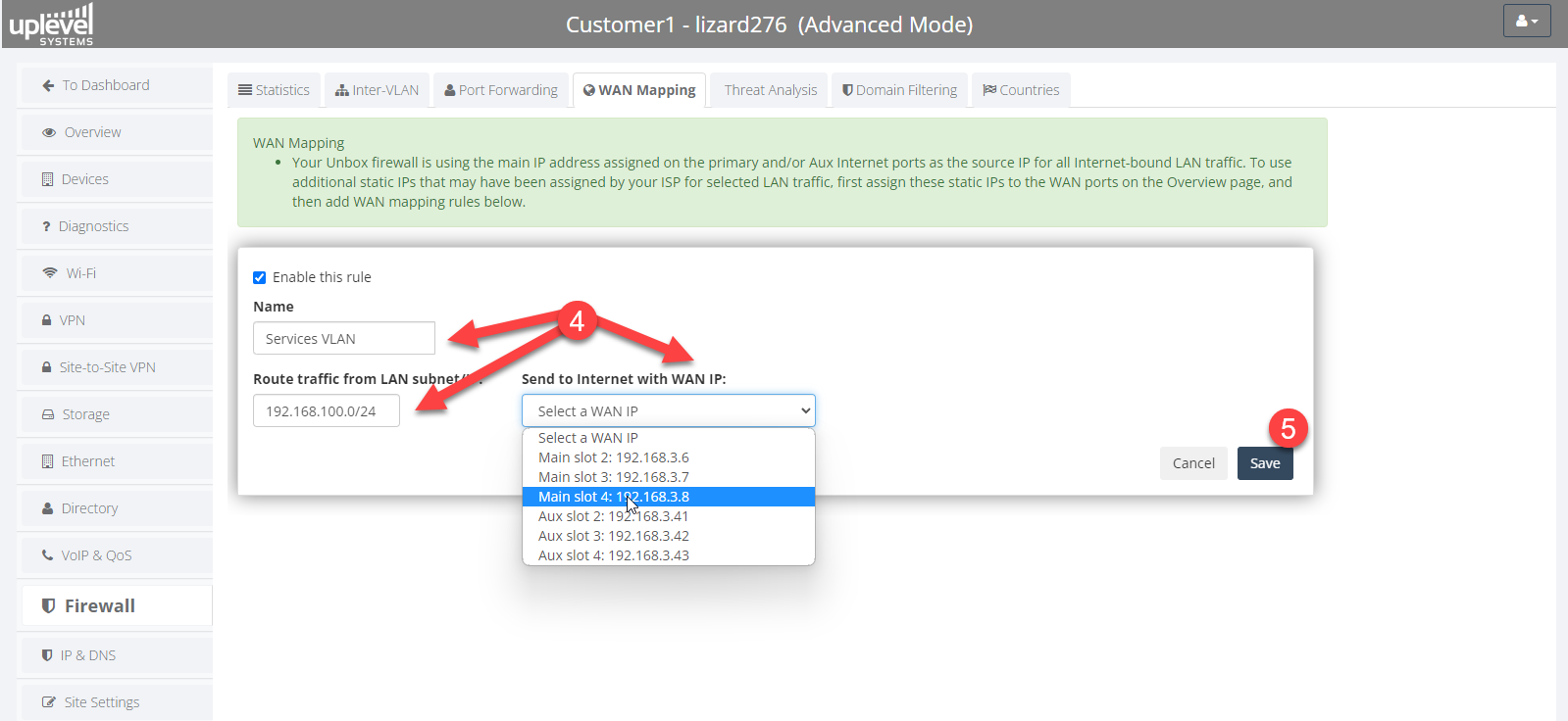 - The client wants to run a video server on premises, but with a different public IP address than the one used by regular internet users. In that situation, they'd configure port forwarding to route any ports hitting that public IP to the video server, and then configure WAN mapping to route all outgoing traffic for that server and its associated video cameras (i.e., the LAN). This has the effect of a DMZ.