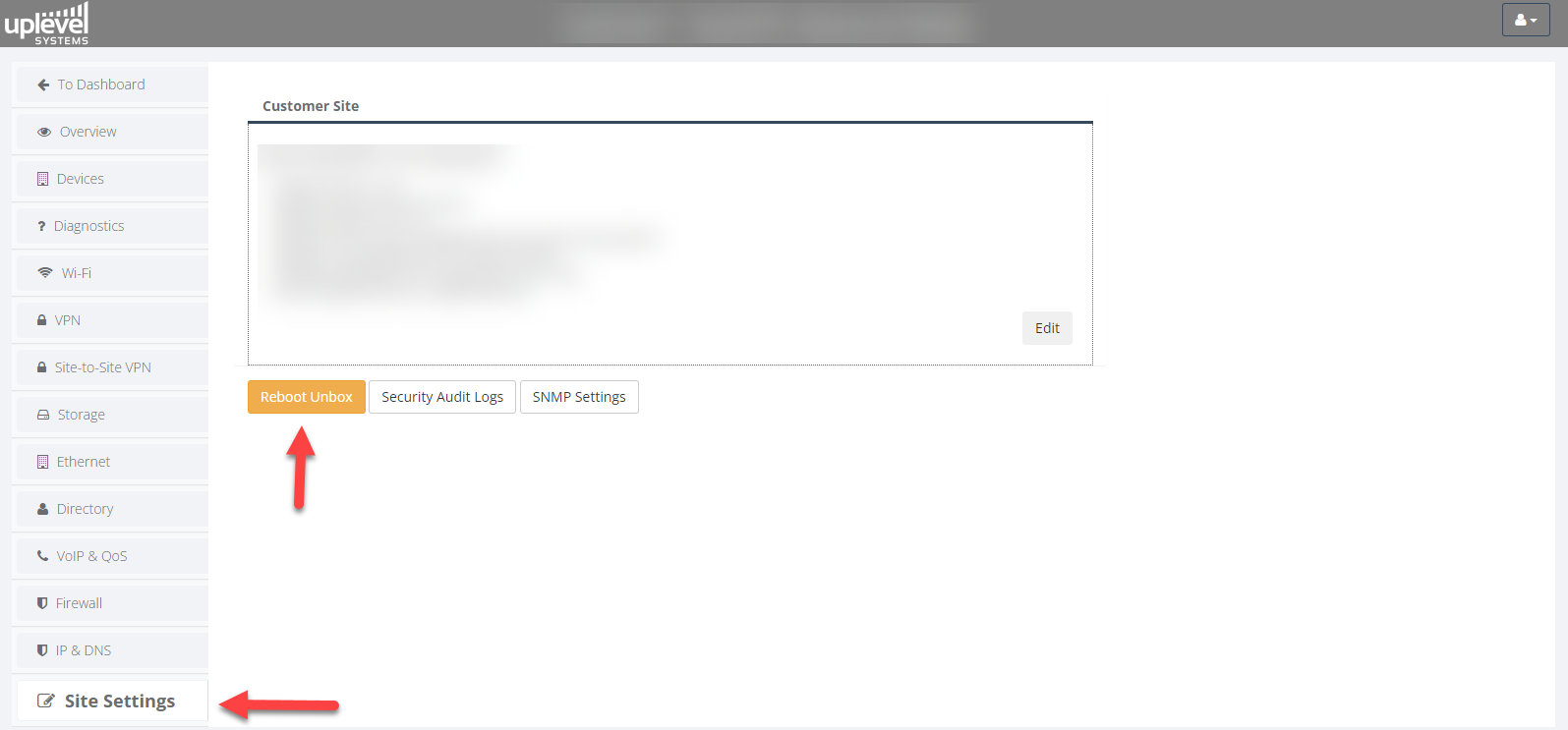 Restarting a Gateway can be done either by pulling and replacing the power-cable, or in the Portal > Sites Settings section: